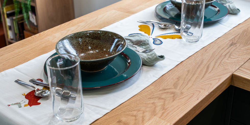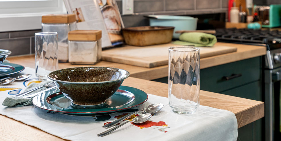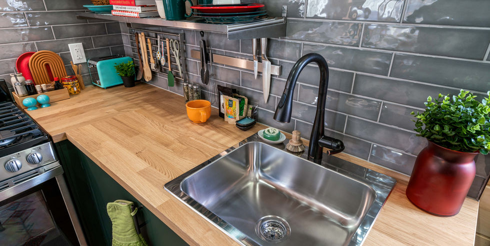 General: Wood veneer counter, large pantry with microwave nook (microwave not included), open shelving, dish drying rack and knife magnet.