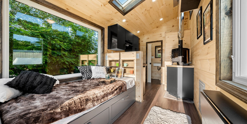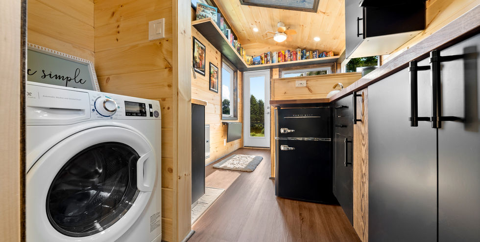Brimming with light and rustic charm, this 20-ft x 8.5-ft custom home includes a porch, wood burning stove, daybed, kitchen, laundry area, wrap-around floating shelf, and compact bathroom.
