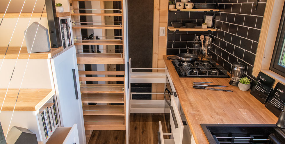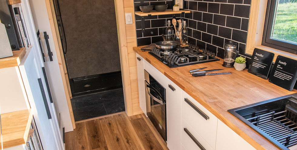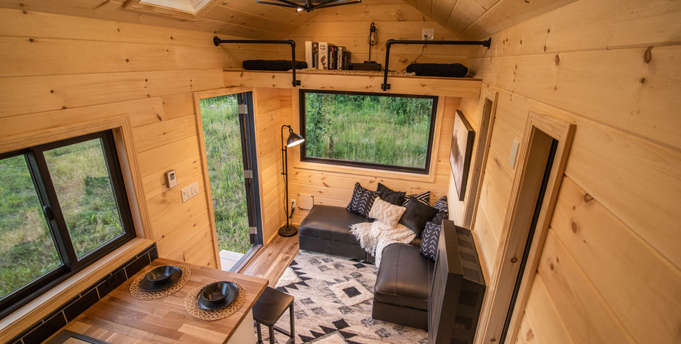 Blending Nordic minimalism with natural warmth, this 24-ft x 8.5-ft custom home includes a large kitchen, plenty of storage, wall-mounted gas fireplace, storage loft, sleeping loft, and a tiled standing shower with cove lighting.